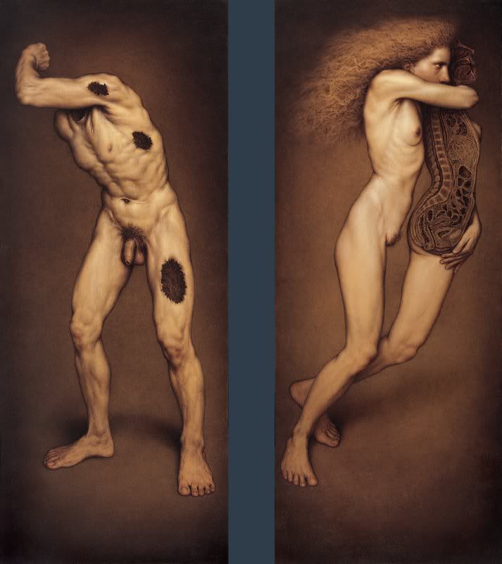 Dino Valls is a Spanish painter of exquisite surreal works which explore the human psyche via the body, medical analogies, religious imagery, and sexuality. Hauntingly beautiful and photorealistic, his paintings have a sense of classicism and an incredible technical virtuosity. The subjects have a radiant, heavenly cast to their faces, reminiscent of classics by old masters and medieval religious paintings. The body is portrayed as fragmented, segmented, doubled, vivisected, deformed, and androgynous – both oddity and sacrosanct vessel. Parts of their anatomy are displaced, scores of needles adorn the ethereal figures.
