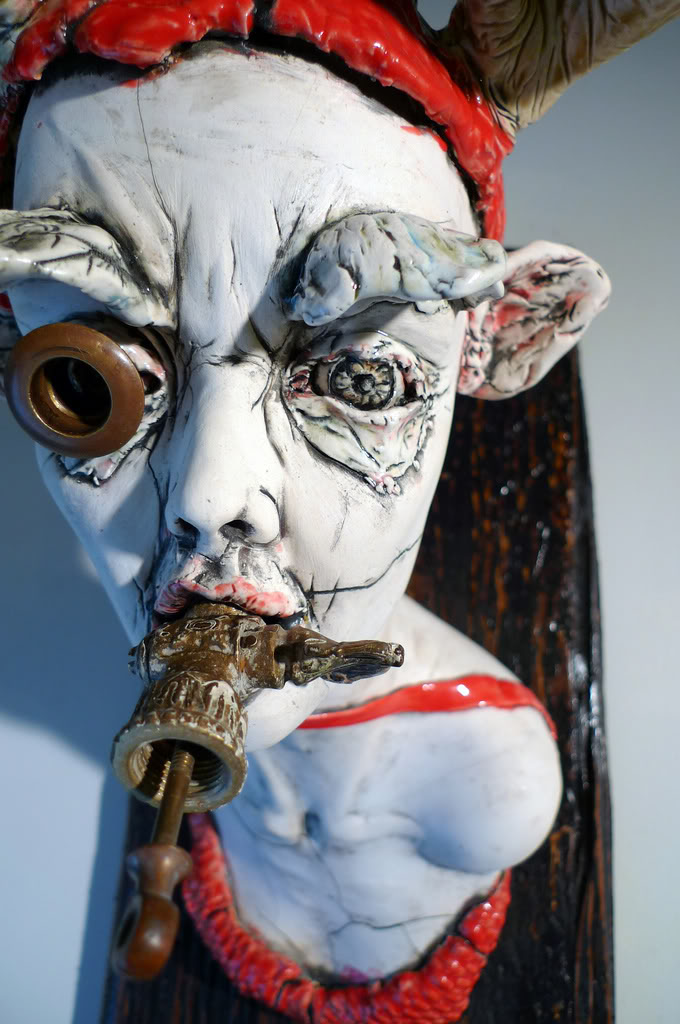 These disturbing and grotesquely beautiful sculptures by Sarah Louise Davey are made of vividly, violently, luridly, fantastically painted ceramic, embodying creatures with bold, tortured, glazed stares, and strange growths either covering their eyes or framing them like sick, rotted petals of flesh carved out around an astonishingly open iris. The effect is unnerving and startling, garish and obscene, yet whimsical and lovely. The pieces appear simultaneously textured and not, curiously both three- and two-dimensional – looking like paintings on porcelain – and the bold, dark lines sketching their features out against the chalky whiteness of the ceramic “flesh” hold a horrific and fascinating quality.