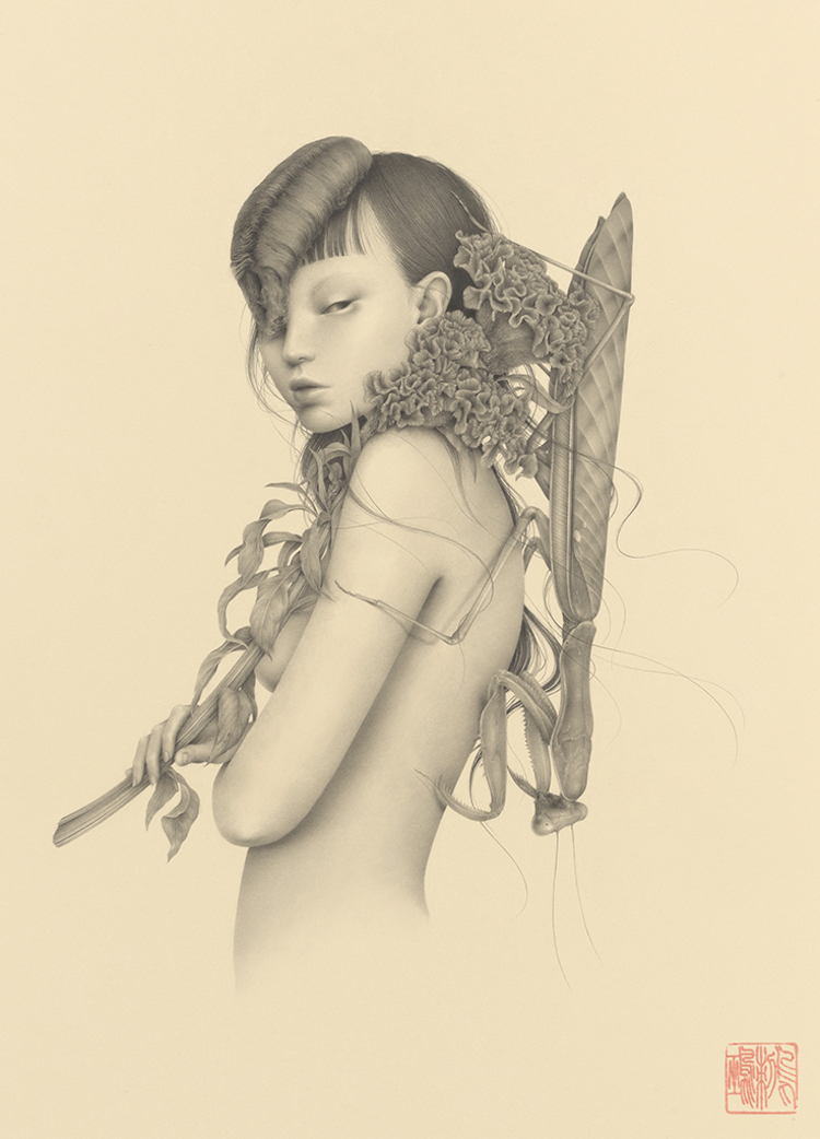Ozabu’s elegant, hyper-realistic pencil and graphite drawings fuse women with birds, mantises, and other fauna and flora. Inspired by Japanese mythology, this delicate linework illustrates a hybrid symbolic imagery with utter precision and ethereal melancholy. Thinkspace describes the figures depicted in her works, which exude a soft radiance, as “woeful apparitions or powerful augurs. Ozabu’s world is a mysteriously beautiful shadow land.” Her solo show Meguru is currently exhibiting at Hashimoto Contemporary in San Francisco through November 23rd.
