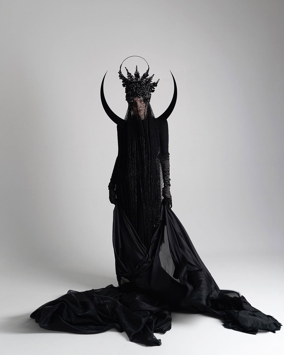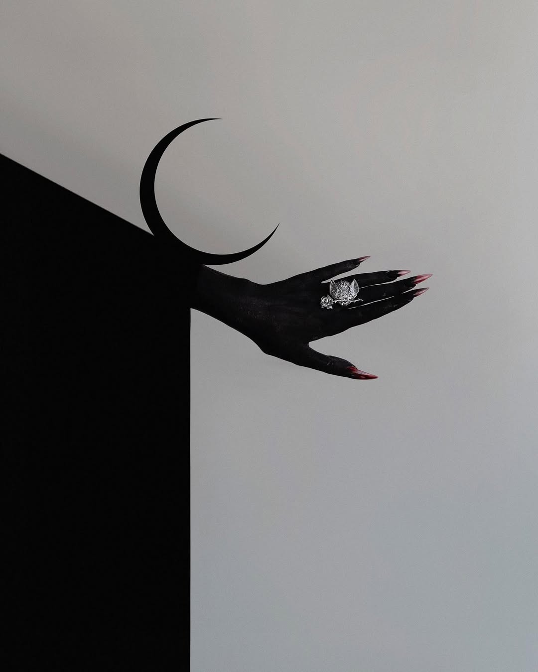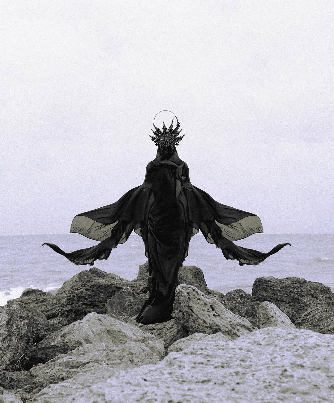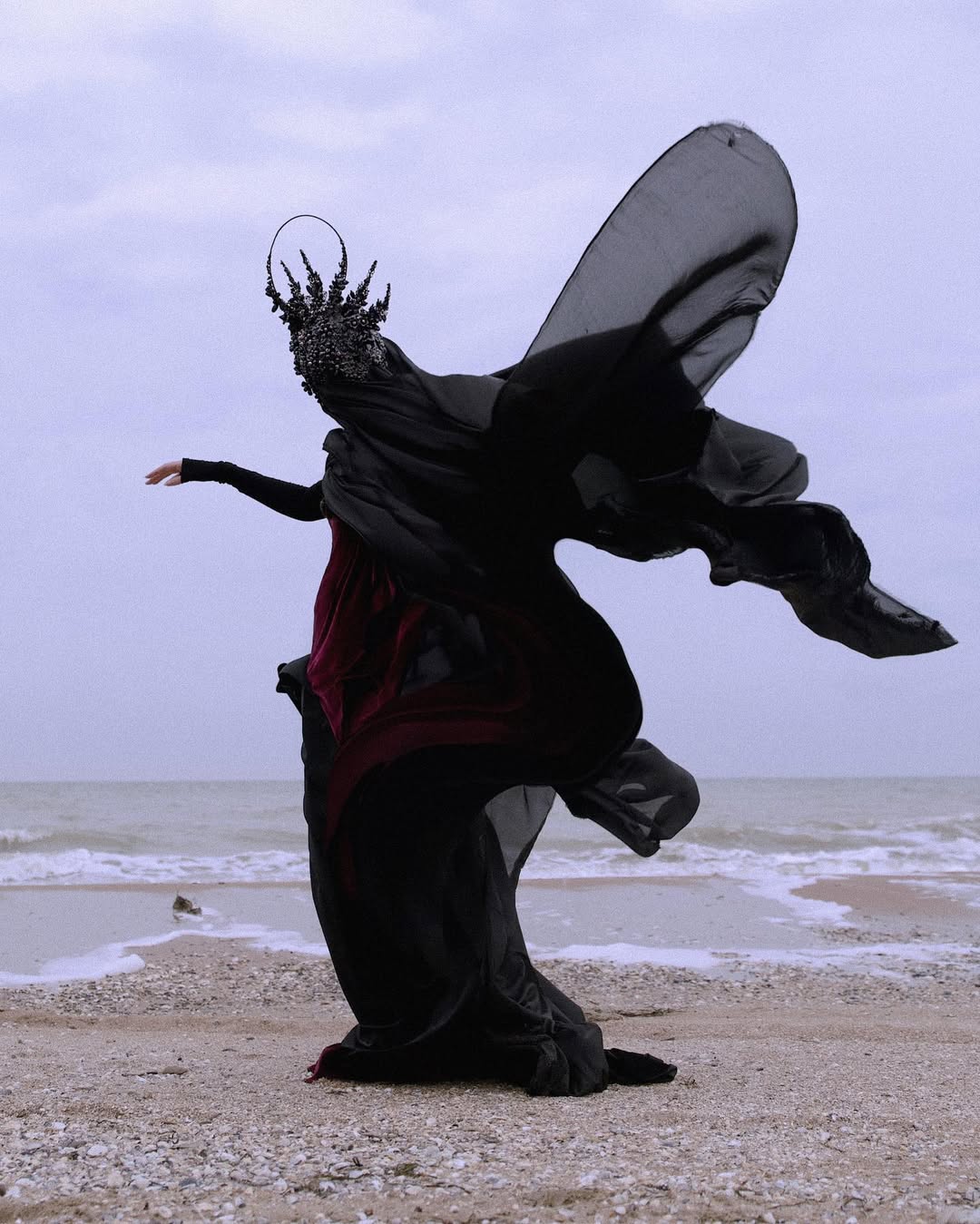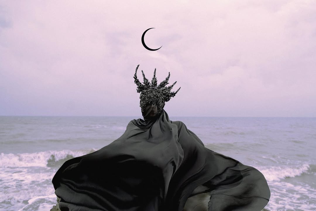 The fashion photography of Naya Kotko is defined by stunning contrast, bold visual impact, and gorgeous, sumptuous dark costumes. Her imagery often features knife-sharp black crescent moons, Renaissance-style swords, long demonic nails, and red or blue backgrounds against which the monochromatic clothing shows up deliciously. Elaborate headdresses as well as both romantically draped and architectural garments form the mysterious and sibylline attire of the subjects of the photographs, whose faces are often obscured by veiling and cloaking. These semi-visageless figures are intensely dramatic, often being preternaturally extended by the extremely long trains of the outfits, while they contort their poetic, nightmarish hands. Some of the images are deceptively simple and take their effect from striking composition. Some appear to be captured in a kind of void, an atmosphere vaguely but theatrically colored, while others are set amidst the brutal and ornate beauty of natural landscapes defined by sea, rock, or cave. The craggy textures of these settings add depth to the images highlighting the severe black of the clothing. Witchy and eerie, Kotko’s photography is stylishly ominous, occupying a perfect space between surreal and elegant.