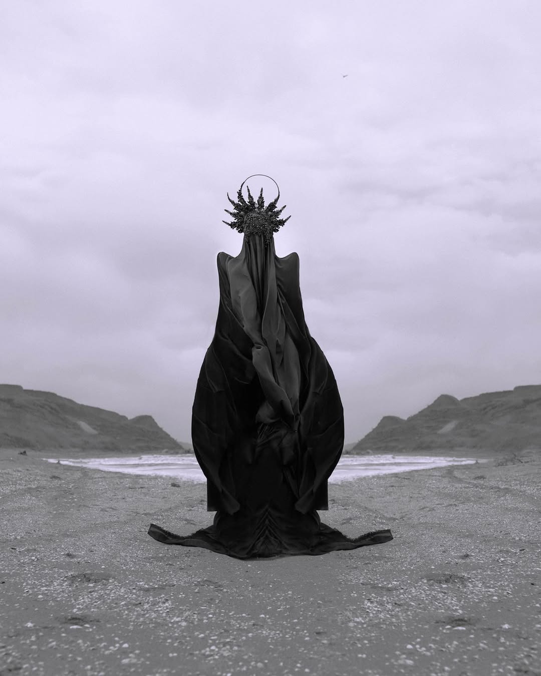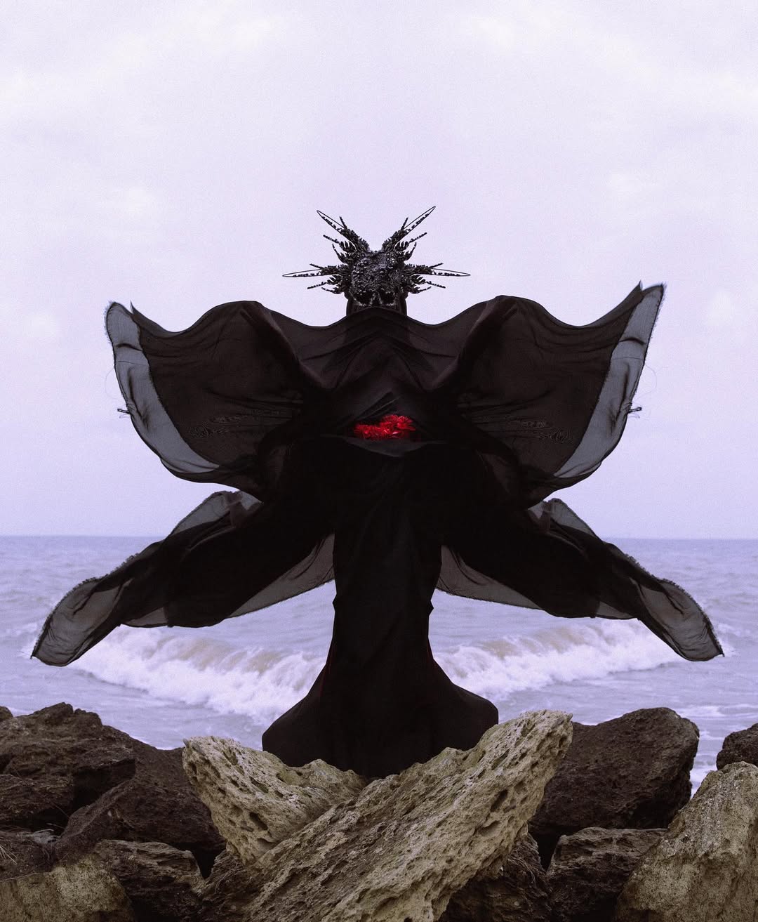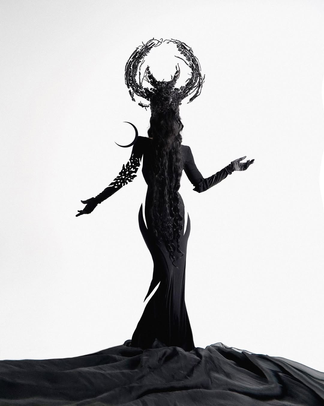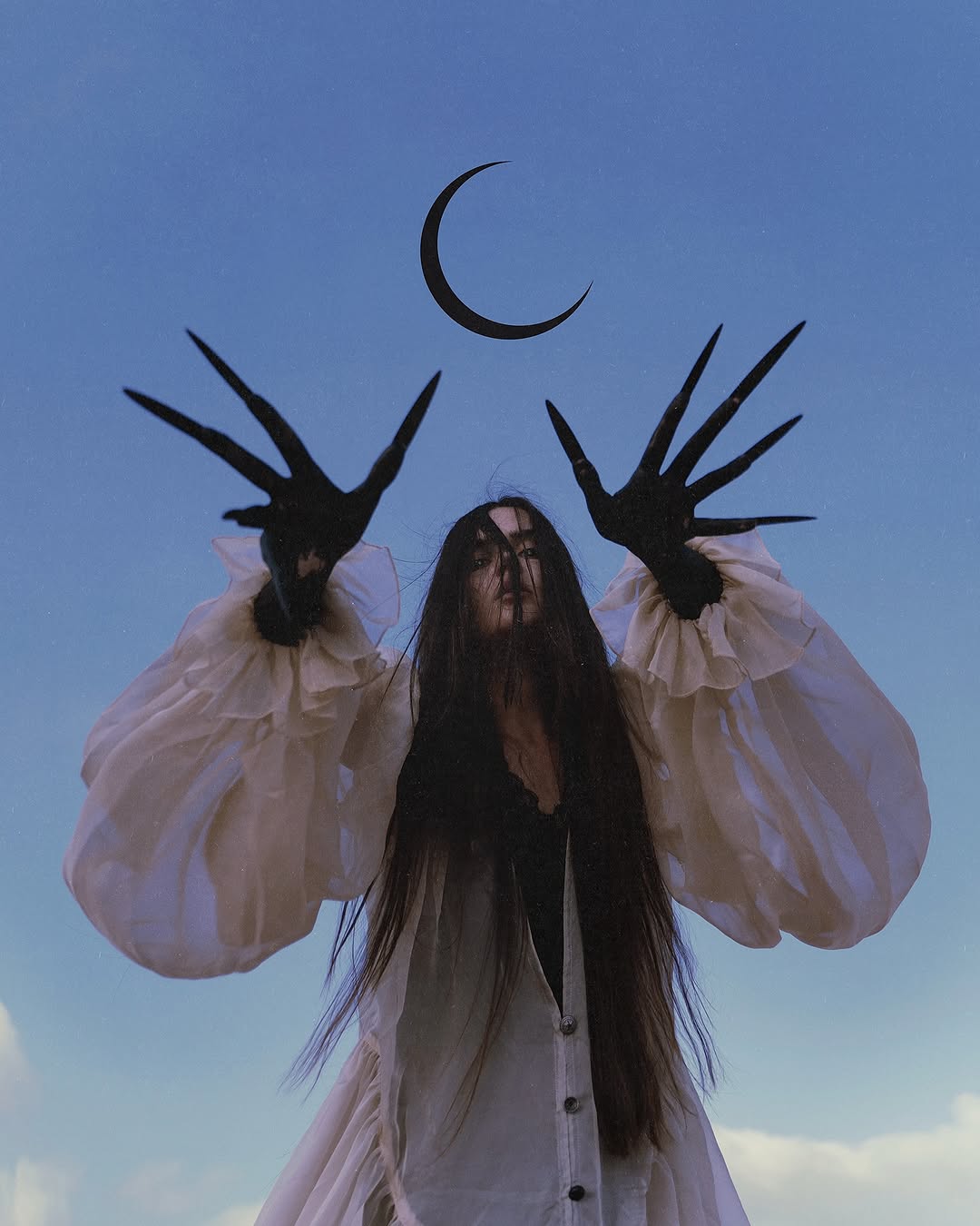 The fashion photography of Naya Kotko is defined by stunning contrast, bold visual impact, and gorgeous, sumptuous dark costumes. Her imagery often features knife-sharp black crescent moons, Renaissance-style swords, long demonic nails, and red or blue backgrounds against which the monochromatic clothing shows up deliciously. Elaborate headdresses as well as both romantically draped and architectural garments form the mysterious and sibylline attire of the subjects of the photographs, whose faces are often obscured by veiling and cloaking. These semi-visageless figures are intensely dramatic, often being preternaturally extended by the extremely long trains of the outfits, while they contort their poetic, nightmarish hands. Some of the images are deceptively simple and take their effect from striking composition. Some appear to be captured in a kind of void, an atmosphere vaguely but theatrically colored, while others are set amidst the brutal and ornate beauty of natural landscapes defined by sea, rock, or cave. The craggy textures of these settings add depth to the images highlighting the severe black of the clothing. Witchy and eerie, Kotko’s photography is stylishly ominous, occupying a perfect space between surreal and elegant.
