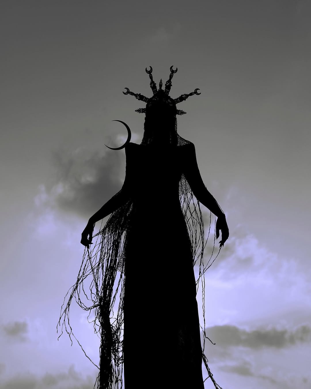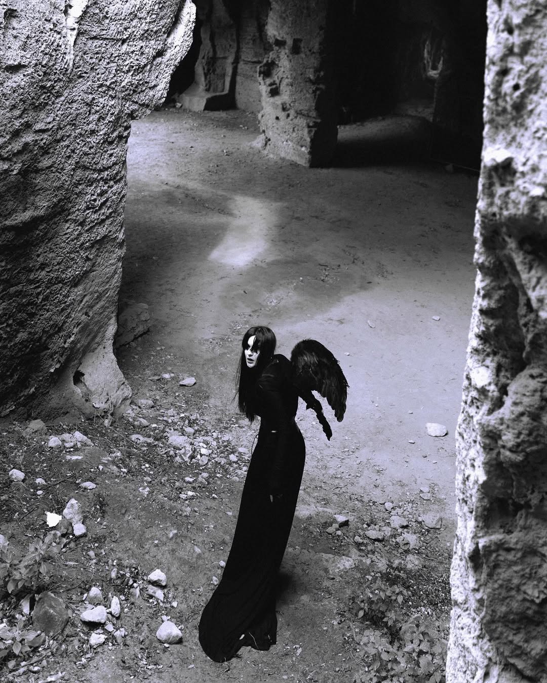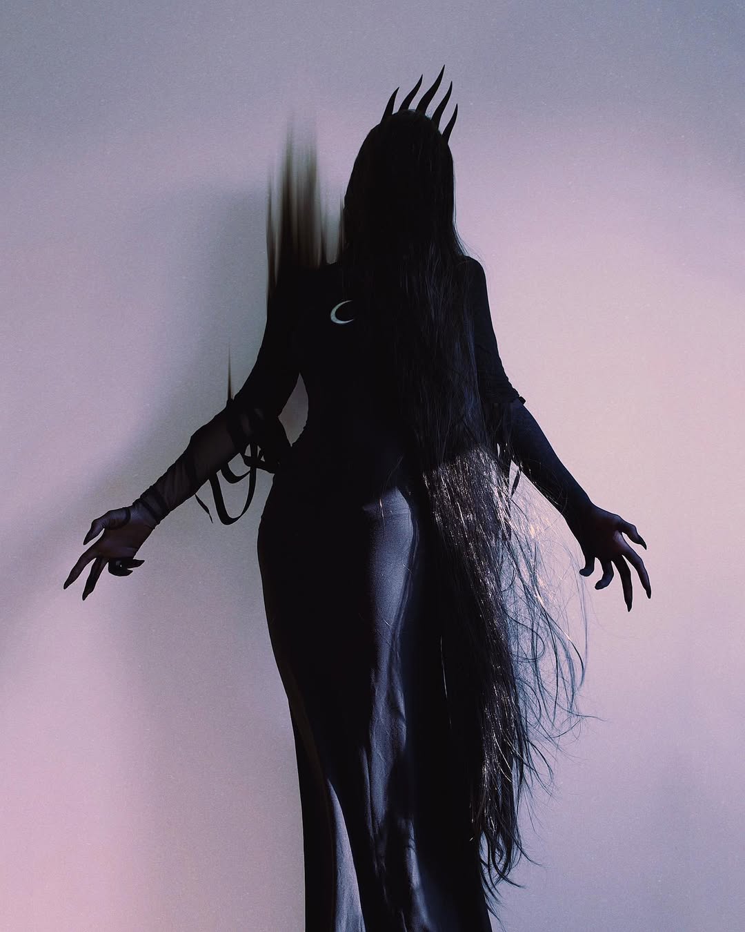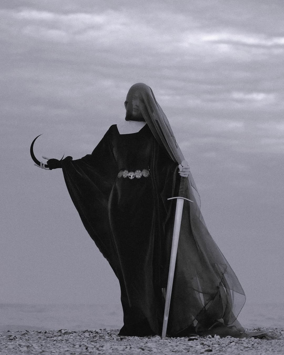 The fashion photography of Naya Kotko is defined by stunning contrast, bold visual impact, and gorgeous, sumptuous dark costumes. Her imagery often features knife-sharp black crescent moons, Renaissance-style swords, long demonic nails, and red or blue backgrounds against which the monochromatic clothing shows up deliciously. Elaborate headdresses as well as both romantically draped and architectural garments form the mysterious and sibylline attire of the subjects of the photographs, whose faces are often obscured by veiling and cloaking. These semi-visageless figures are intensely dramatic, often being preternaturally extended by the extremely long trains of the outfits, while they contort their poetic, nightmarish hands. Some of the images are deceptively simple and take their effect from striking composition. Some appear to be captured in a kind of void, an atmosphere vaguely but theatrically colored, while others are set amidst the brutal and ornate beauty of natural landscapes defined by sea, rock, or cave. The craggy textures of these settings add depth to the images highlighting the severe black of the clothing. Witchy and eerie, Kotko’s photography is stylishly ominous, occupying a perfect space between surreal and elegant.