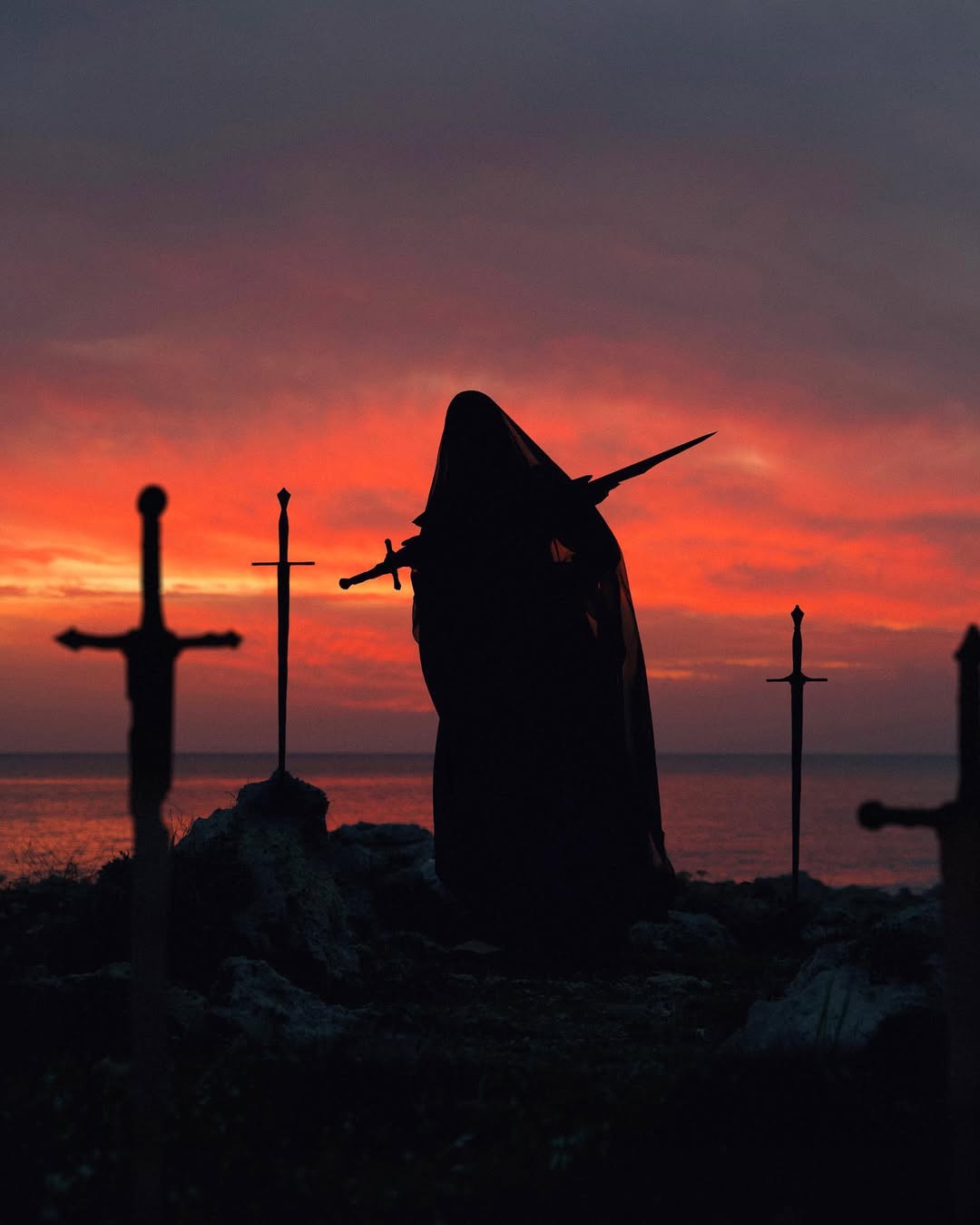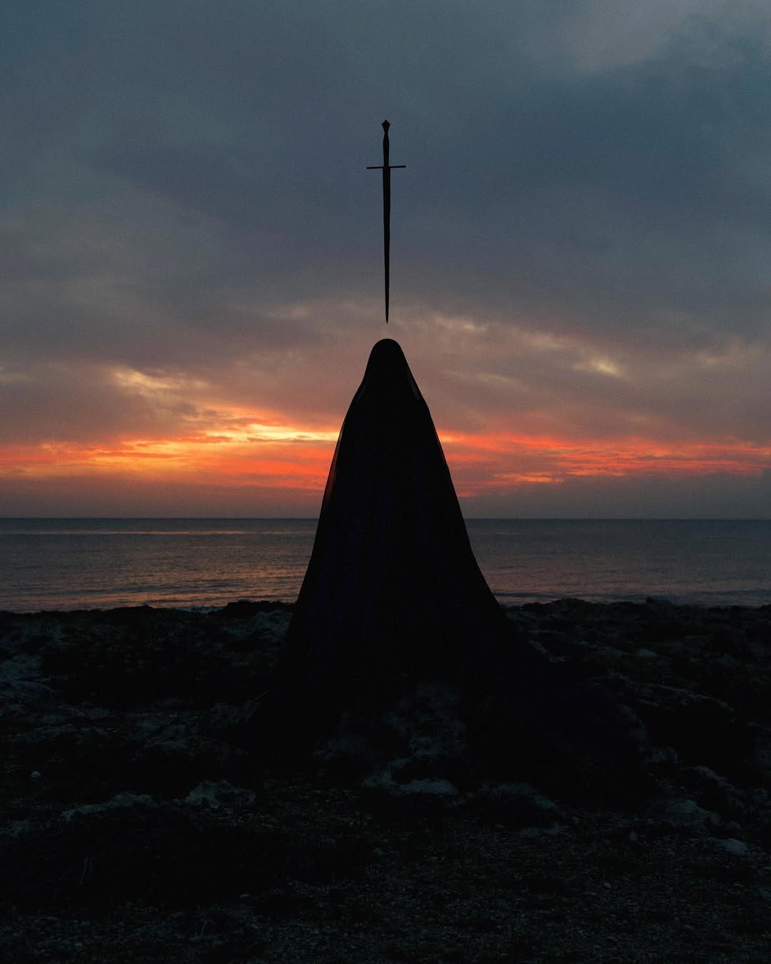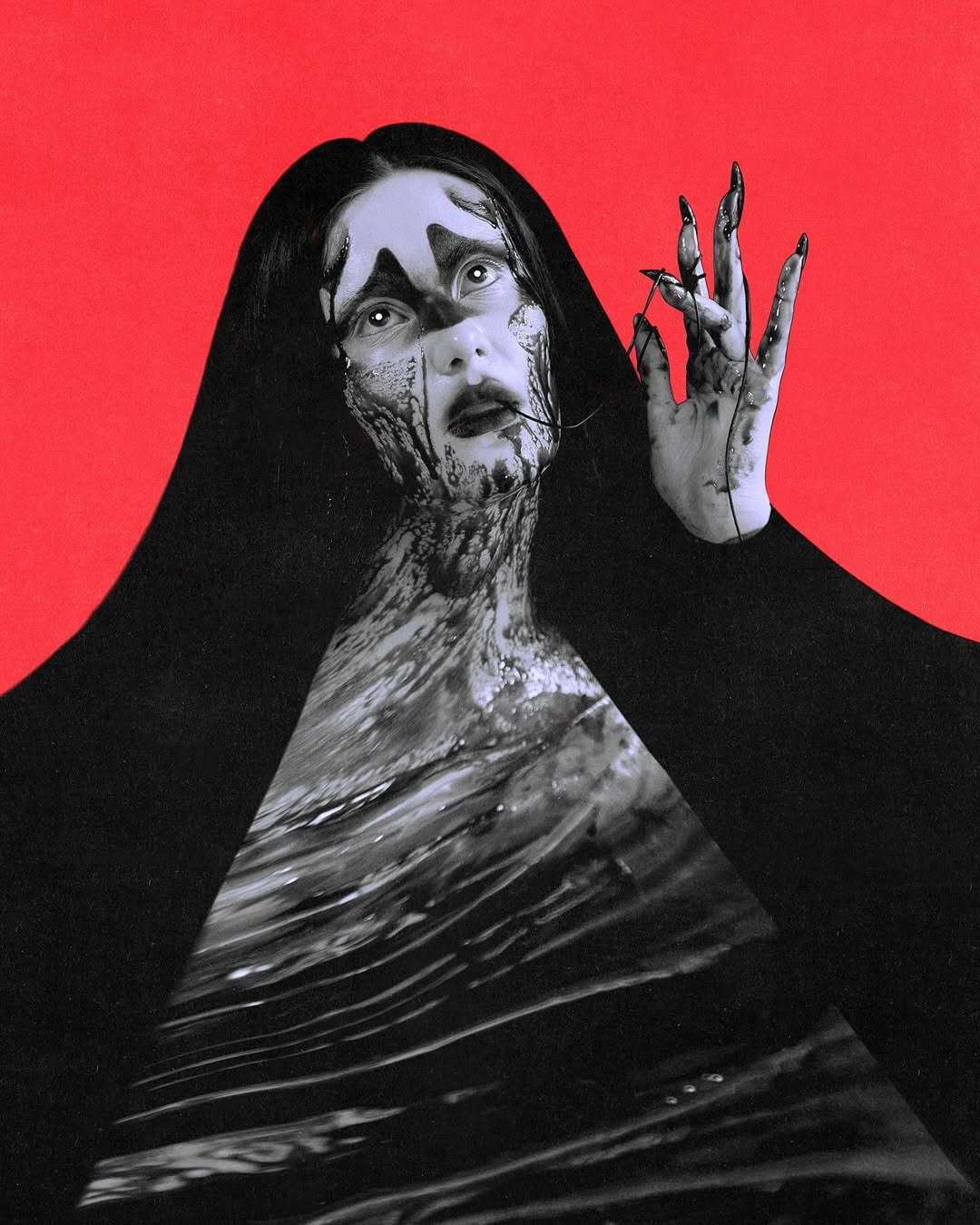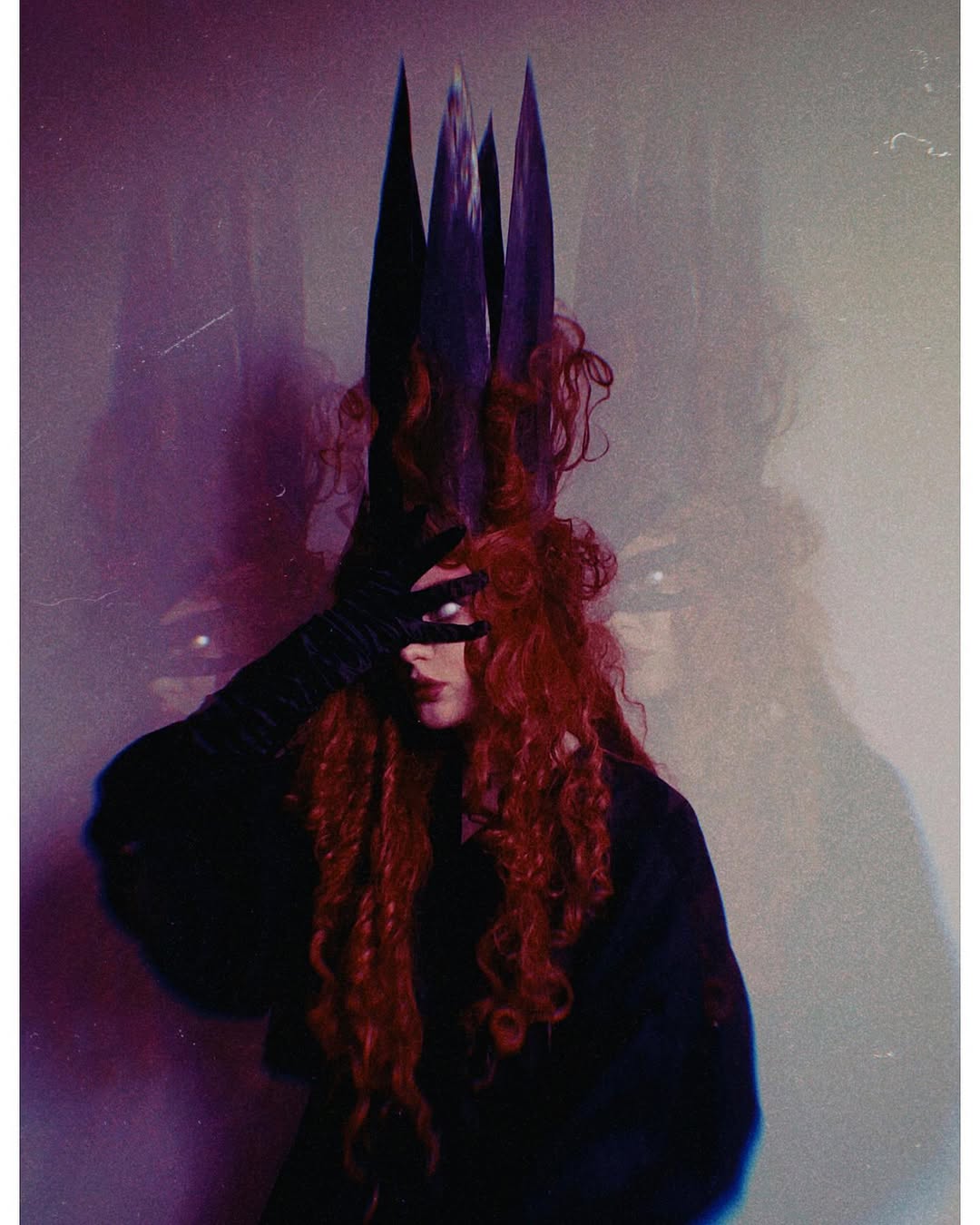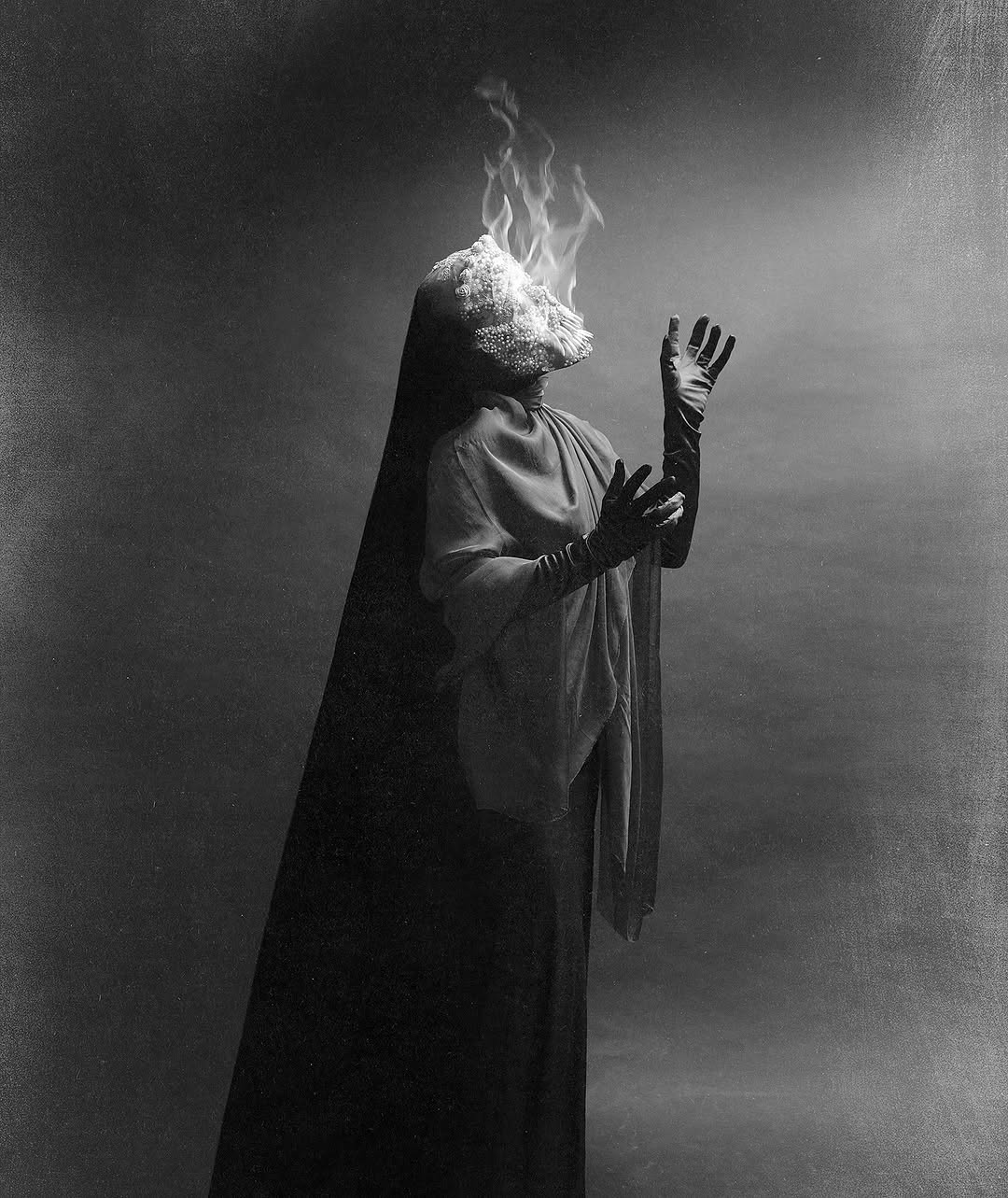 The fashion photography of Naya Kotko is defined by stunning contrast, bold visual impact, and gorgeous, sumptuous dark costumes. Her imagery often features knife-sharp black crescent moons, Renaissance-style swords, long demonic nails, and red or blue backgrounds against which the monochromatic clothing shows up deliciously. Elaborate headdresses as well as both romantically draped and architectural garments form the mysterious and sibylline attire of the subjects of the photographs, whose faces are often obscured by veiling and cloaking. These semi-visageless figures are intensely dramatic, often being preternaturally extended by the extremely long trains of the outfits, while they contort their poetic, nightmarish hands. Some of the images are deceptively simple and take their effect from striking composition. Some appear to be captured in a kind of void, an atmosphere vaguely but theatrically colored, while others are set amidst the brutal and ornate beauty of natural landscapes defined by sea, rock, or cave. The craggy textures of these settings add depth to the images highlighting the severe black of the clothing. Witchy and eerie, Kotko’s photography is stylishly ominous, occupying a perfect space between surreal and elegant.
