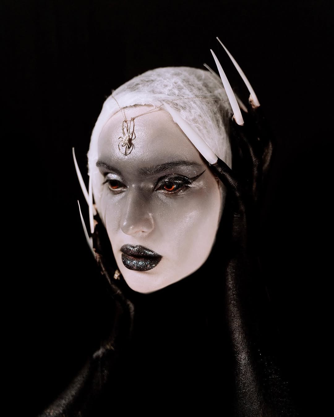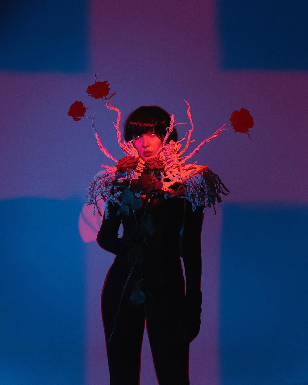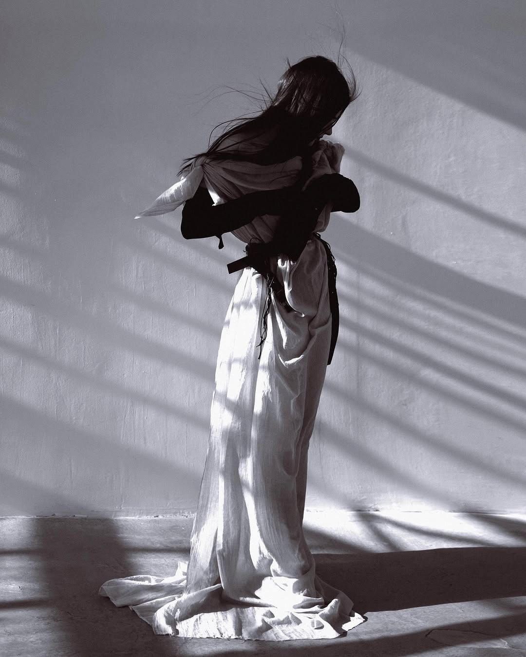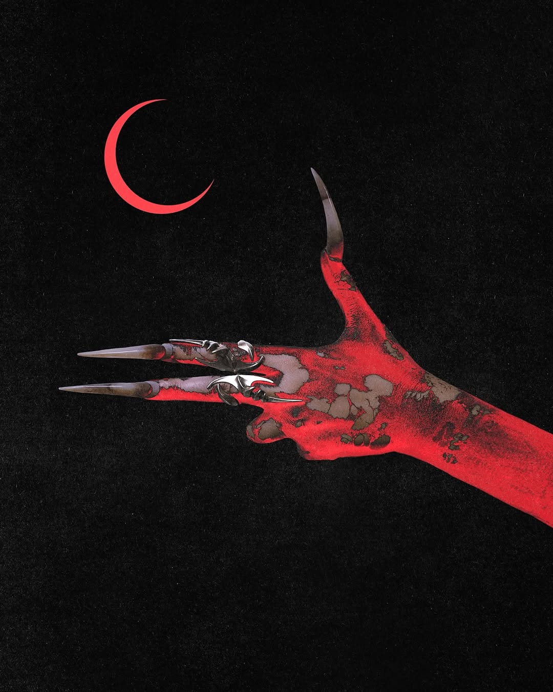 The fashion photography of Naya Kotko is defined by stunning contrast, bold visual impact, and gorgeous, sumptuous dark costumes. Her imagery often features knife-sharp black crescent moons, Renaissance-style swords, long demonic nails, and red or blue backgrounds against which the monochromatic clothing shows up deliciously. Elaborate headdresses as well as both romantically draped and architectural garments form the mysterious and sibylline attire of the subjects of the photographs, whose faces are often obscured by veiling and cloaking. These semi-visageless figures are intensely dramatic, often being preternaturally extended by the extremely long trains of the outfits, while they contort their poetic, nightmarish hands. Some of the images are deceptively simple and take their effect from striking composition. Some appear to be captured in a kind of void, an atmosphere vaguely but theatrically colored, while others are set amidst the brutal and ornate beauty of natural landscapes defined by sea, rock, or cave. The craggy textures of these settings add depth to the images highlighting the severe black of the clothing. Witchy and eerie, Kotko’s photography is stylishly ominous, occupying a perfect space between surreal and elegant.
