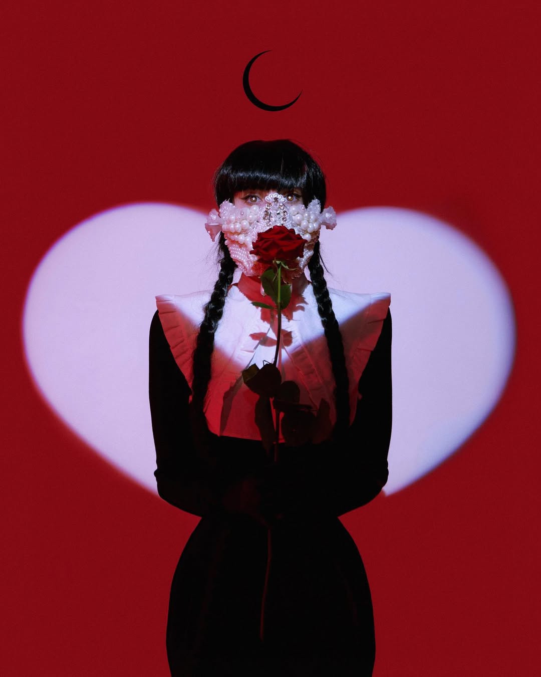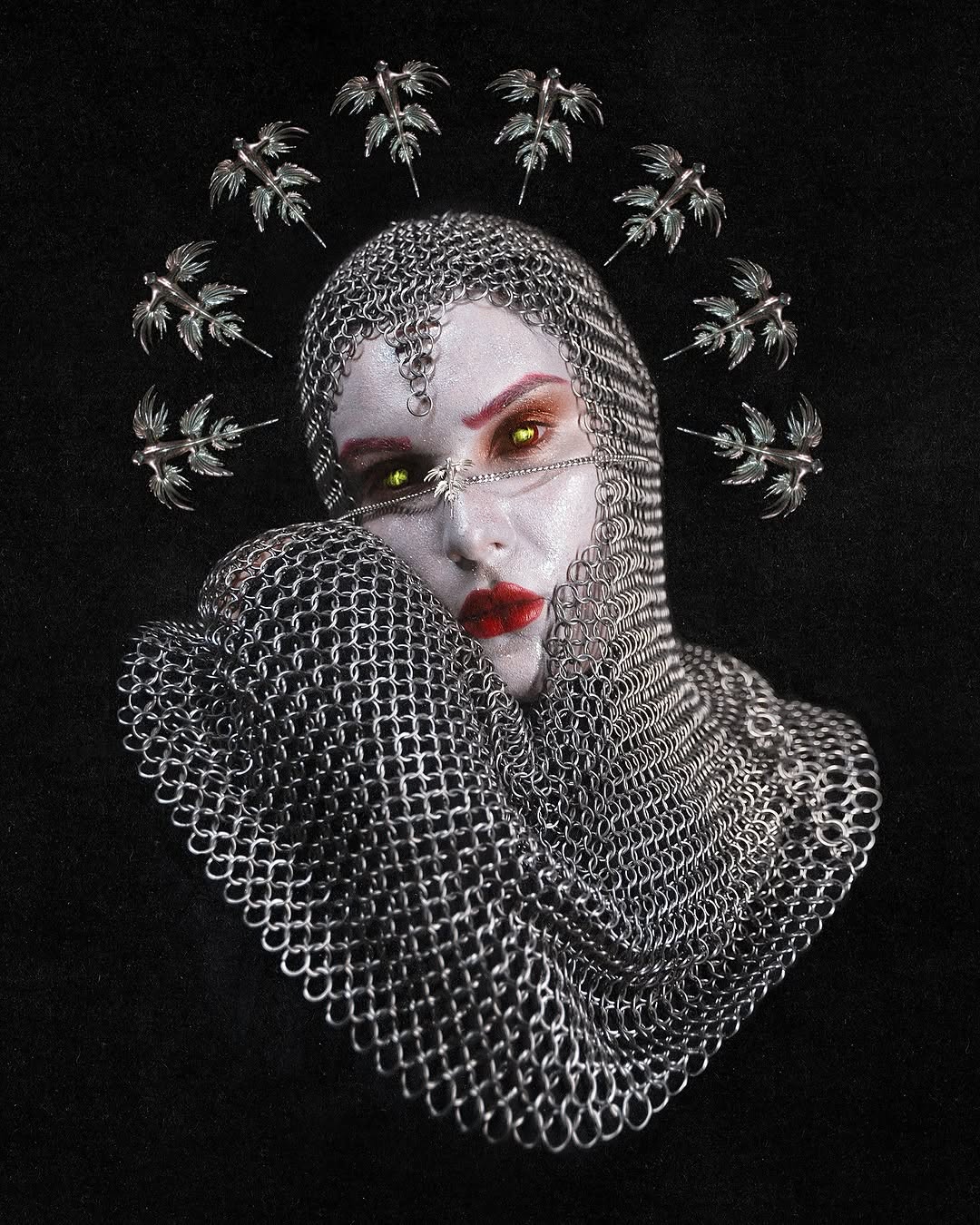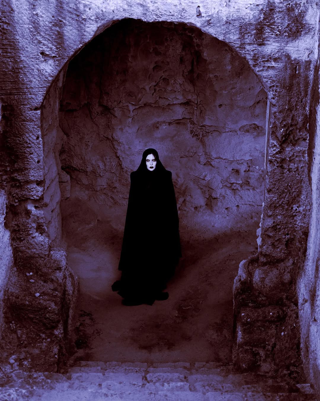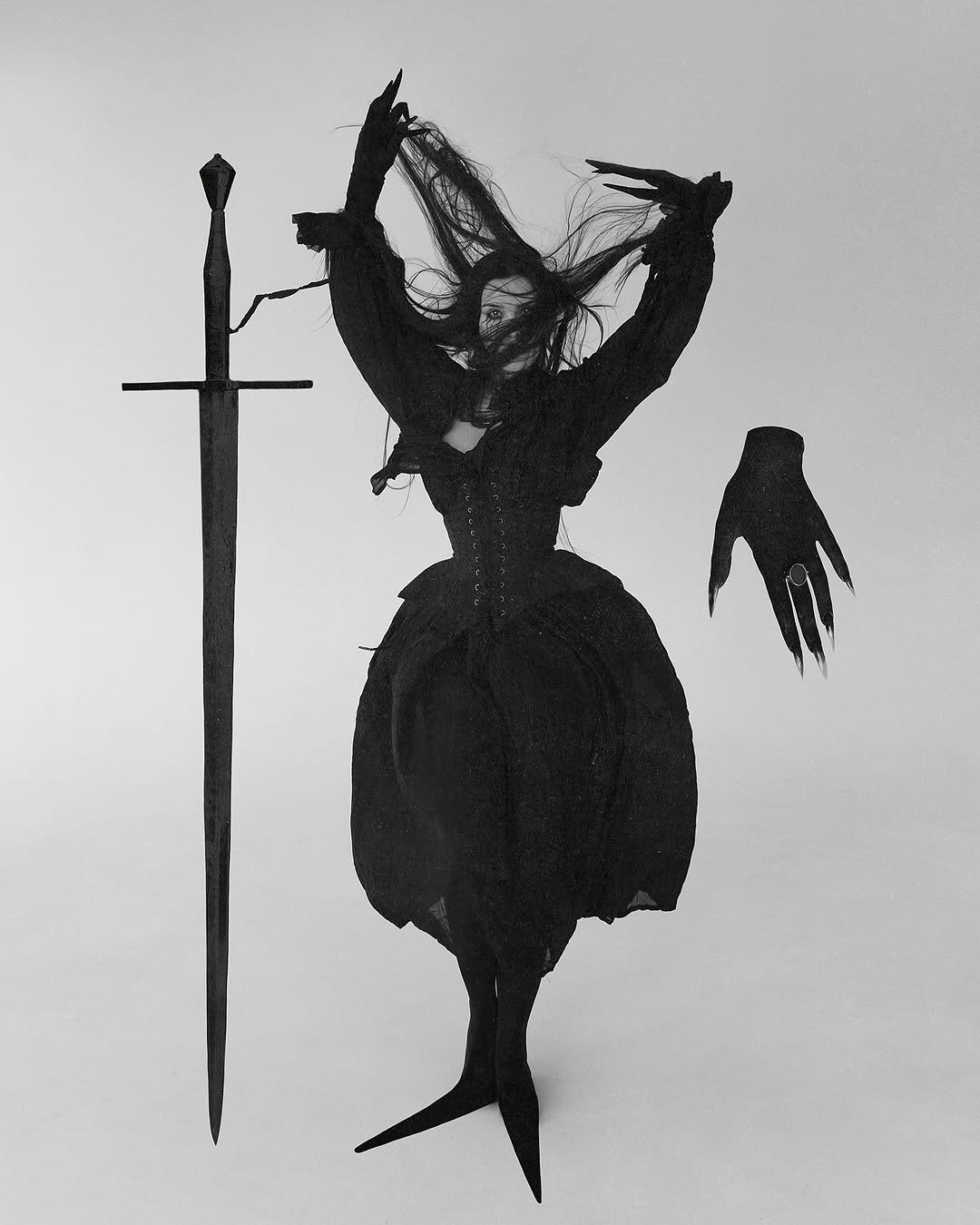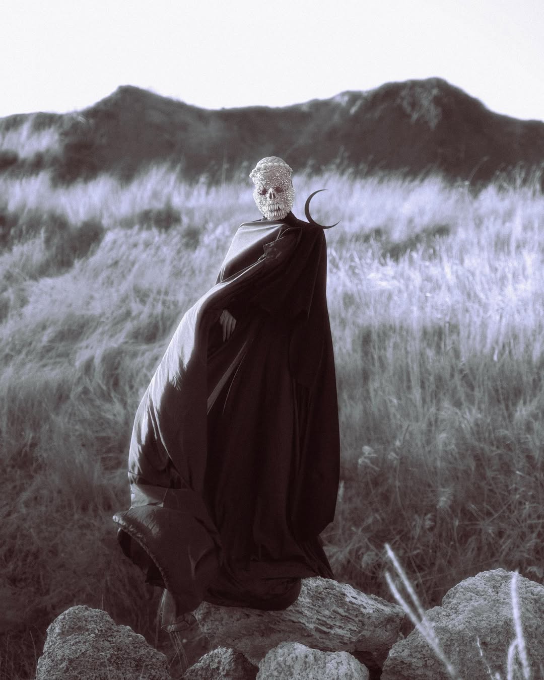 The fashion photography of Naya Kotko is defined by stunning contrast, bold visual impact, and gorgeous, sumptuous dark costumes. Her imagery often features knife-sharp black crescent moons, Renaissance-style swords, long demonic nails, and red or blue backgrounds against which the monochromatic clothing shows up deliciously. Elaborate headdresses as well as both romantically draped and architectural garments form the mysterious and sibylline attire of the subjects of the photographs, whose faces are often obscured by veiling and cloaking. These semi-visageless figures are intensely dramatic, often being preternaturally extended by the extremely long trains of the outfits, while they contort their poetic, nightmarish hands. Some of the images are deceptively simple and take their effect from striking composition. Some appear to be captured in a kind of void, an atmosphere vaguely but theatrically colored, while others are set amidst the brutal and ornate beauty of natural landscapes defined by sea, rock, or cave. The craggy textures of these settings add depth to the images highlighting the severe black of the clothing. Witchy and eerie, Kotko’s photography is stylishly ominous, occupying a perfect space between surreal and elegant.